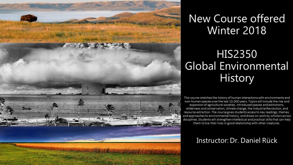 New Course! Leave a reply I’m offering a new introductory-level course in environmental history this year at the University of Ottawa: HIS2350 Global Environmental History Share this: Click to share on X (Opens in new window) X Click to share on Facebook (Opens in new window) Facebook Like Loading... Related